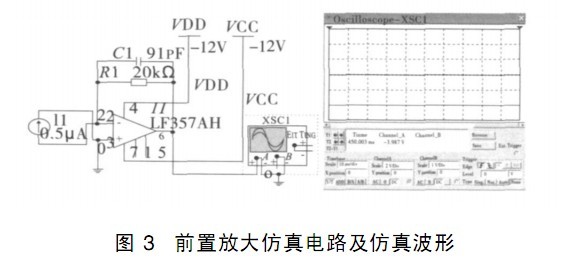 (2)設計合理的通頻帶; 通過電容 Cs 與反饋電阻Rf 的并聯, 構成低通濾波電路,其上限截止頻率為1/ 2%:Cs:Rf 。上限截止頻率越小,信號輸出信噪比越好;但較小的上限截止頻率會使信號產生頻率失真,具體使用時要根據實際情況調試而定;