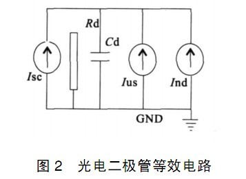 圖2 中I sc為光電流; Rd 為二極管內阻; Cd 為二級管結電容; I ns 為二級管的散粒噪聲電流; I nd為二極管內阻的熱噪聲電流。 光電二極管與后續的理想運放構成前置放大電路時, 影響其性能參數的因素主要是以下幾點: