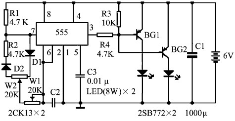 用555 時基電路可組成各種形式的自激式多諧振蕩器。大功率LED 頻閃光源,主要由1 個555 多諧振蕩器構成的信號發(fā)生器、1 個功率放大器和2 個LED 組成。信號發(fā)生器的作用是產生所需要的工作頻率脈沖,并且振蕩頻率可以根據需要調整。功率放大器將脈沖信號放大后,驅動大功率LED 發(fā)光。改變信號發(fā)生器的振蕩頻率,可使光源的頻閃時間間隔隨之變化;過增、減LED 個數或更換不同功率的LED ,可以改變光源的總亮度。如圖3 所示,電路中的555 多諧振蕩器電路,既可以調節(jié)振蕩頻率,又可以調整振蕩脈沖的占空比。信號發(fā)生器的振蕩頻率就是LED 閃光的頻率,可以根據拍攝對象調整。而振蕩脈沖的占空比,決定了LED 每次頻閃的延續(xù)時間。