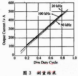 圖4為在PWM調光模式下外加PWM脈沖驅動信號和輸出驅動電流的測量結果。PWM占空比從0~100%。從圖中可以清楚的看到,通過改變不同的PWM占空比可以調節額定電流,PT4115最大能夠輸出1.2 A的電流。
