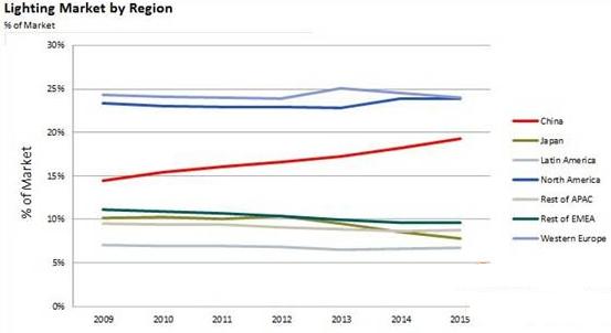 經(jīng)濟(jì)發(fā)達(dá)地區(qū)比如北美和歐洲將會(huì)是照明市場(chǎng)增長(zhǎng)的主要區(qū)域,將會(huì)占到50%左右的市場(chǎng)份額($US)。2010年,中國(guó)占到全球照明市場(chǎng)的14%,2015年預(yù)計(jì)會(huì)增至20%。持續(xù)的經(jīng)濟(jì)增長(zhǎng),建設(shè)熱潮,對(duì)于電力消耗增大的擔(dān)憂以及公眾購(gòu)買能力的提升會(huì)影響該區(qū)域的市場(chǎng)。