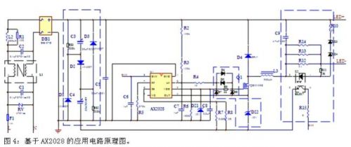 電路采用了EMI抑制電路、整流濾波電路、填谷PFC電路、AX2028恒流系統電路來驅動LED工作。
