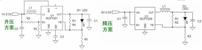 圖3:基于NCP1421的升壓型和基于NCP1529的降壓型1-3 W手電筒LED應用