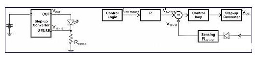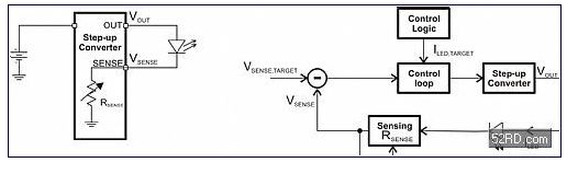 將閃光燈 LED 與一個(gè)電流檢測(cè)電阻串聯(lián),然后通過(guò)一個(gè)升壓轉(zhuǎn)換器來(lái)驅(qū)動(dòng),這是一種簡(jiǎn)單的方法。圖 1 描述了這種方法。