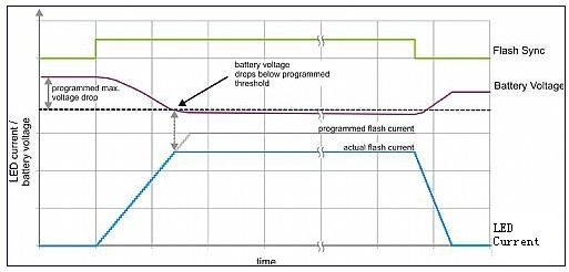 如果閃光燈驅(qū)動(dòng)器本身能夠防止電池電壓下降過(guò)多,那么就可以保持較小的安全界限。通過(guò)使用一個(gè)受控轉(zhuǎn)換率升高 LED 電流,并在上升期間持續(xù)監(jiān)控電池電壓可以實(shí)現(xiàn)這一目標(biāo)。