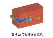 另一種主動冷卻系統(tǒng)是利用壓電驅動而產生脈動空氣,如圖4所示。該結構簡單,由一個PZT膜片和流動通道構成。該流動通道中設計者重點論述了出口和進口通道的設計。這種結構允許每一個振動周期中的流體在管道中的阻力和動力差別。