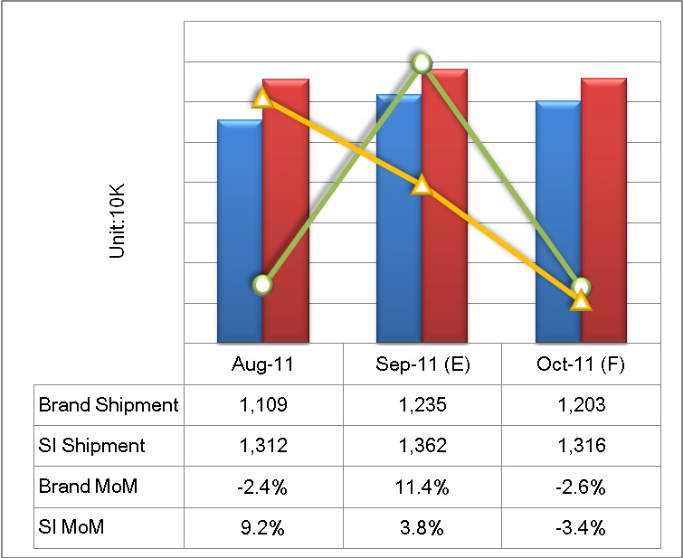 WitsView表示今年液晶顯示器年成長將呈現持平狀態,全年預估出貨約為168M(臺)。另外,預估AIO出貨量約為12~12.5M左右,由于今年全球景氣受到歐洲債務危機延燒沖擊,整體市場規模有限,各品牌廠商截至目前為止出貨量距離全年目標尚有一段距離,再加上歐美市場需求疲軟,因此各品牌廠商將集中于中國十一長假期間放手一搏,透過強力降價促銷以把握機會沖刺,以爭取全年市占率。