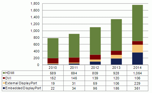 去年In-Stat 觀察到HDMI在移動消費性裝置上有快速成長,例如手持式高清攝影機、數碼相機等。而在電腦的部分,今年起HDMI在移動電腦 (包含筆記本電腦、上網本和平板電腦等)、繪圖卡、以及電腦顯示器等等的搭載比重正不斷攀升。根據In-Stat最新的PC/Display Interface By Device, Q4’11 Forecast (電腦與顯示器接口統計數據庫與預測)報告指出,2011年搭載有HDMI接口的移動電腦的數量為1億4千8百萬臺(包括筆記本電腦、上網本和平板電腦等),相較于2010年的1億零3百萬臺的出貨成長了43%;而在移動電腦不斷強調高分辨率多媒體數字娛樂播放的趨勢之下,預計2014年搭載有HDMI接口的移動電腦的數量將可達3億臺以上。另外,Embedded DsiplayPort的接口成長亦十分快速,搭載有Embedded DisplayPort的移動電腦裝置預計將由2010年的8百萬個快速成長到2014年的3億個以上。
