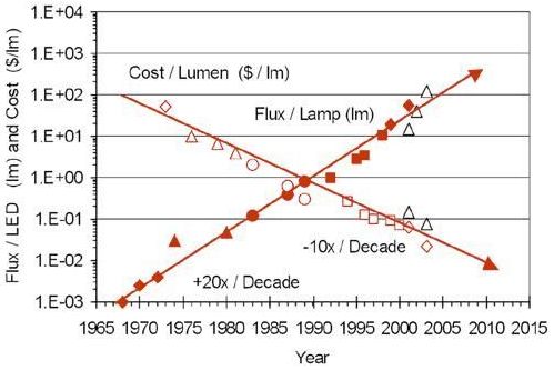 依據(jù)過去30年LED發(fā)展觀察,Lumileds Lighting公司的Roland Haitz先生于2003年歸納出LED界的Moore(摩爾)定律—Haitz定律(如圖1所示),說明LED約每18~24個月可提升一倍的亮度,以此定理推估10年內(nèi)LED亮度可以再提升20倍,而成本將可降90%以達到可完全取代現(xiàn)有照明技術,因此LED照明于近幾年火熱的被重視與探討。