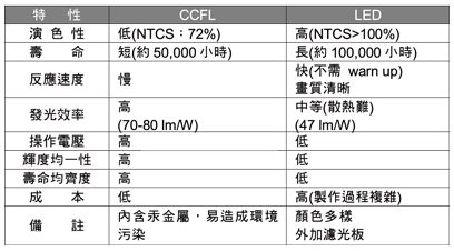 LED因耗電低、不含汞、壽命長、體積小、降低二氧化碳排放量等優(yōu)勢吸引國內(nèi)、外廠商極力推廣取代現(xiàn)有照明。 LED主要照明可分為顯示背光、車用照明、交通號志與室內(nèi)室外照明,而背光模組于2009年被廣泛的應用于筆記型電腦面板上,此后亦逐漸被使用到家用電視機,其約占了50%之面板模組零組件制造成本與消耗約70%顯示器之電能,故背光照明為顯示面板最重要的關鍵。 然液晶顯示器無法自行發(fā)光,因此需要背光模組作為光線的來源,所以背光源的好壞會影響顯示的效果甚劇。 加上面板需薄型化的因素,因此多以CCFL燈管作為背光源,而LED背光源比起CCFL有演色性佳、壽命長、反應速度快等優(yōu)勢(如表1)。