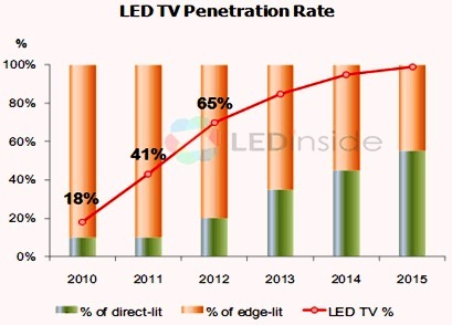 - 2012年LED背光電視(LED TV)滲透率將成長(zhǎng)至65%