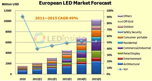 根據(jù)LEDinside調(diào)查, 2011年歐洲 LED照明市場(chǎng)約達(dá)20億美元以上,大約占全球 LED照明市場(chǎng)28%。盡管歐洲市場(chǎng)因?yàn)闅W債而在 2011年有受到影響,但歐盟已經(jīng)積極解決,也反應(yīng)在市場(chǎng)上,隨著LED規(guī)格不斷的提升及大幅度降價(jià)等影響,LEDinside預(yù)估歐洲 LED照明市場(chǎng)每年都將會(huì)有大幅度成長(zhǎng),2015年歐洲 LED照明市場(chǎng)將會(huì)突破100億美元規(guī)模。