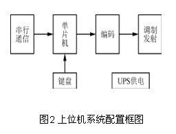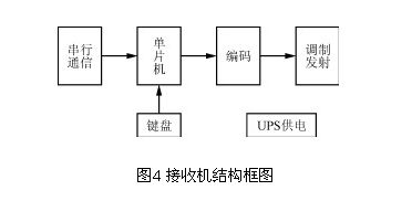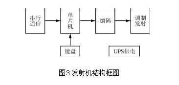 發射機由單片機、鍵盤、編碼器、發射器、串行通信接口和UPS供電系統組成,其結構框圖如圖3所示。