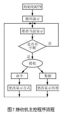 該部分軟件的功能是完成對接收數據的識別、存儲、變換和顯示驅動,并可實現本地本機的自檢,顯示固化圖像。當接收裝置的譯碼芯片有輸出時,單片機就中斷當前的顯示,接收標志字,然后判斷此標志字的內容,確定將接收的是圖像點陣,還是操作控制命令。若是點陣數據,就將其連續接收存放到一個顯示緩沖數據庫中,按當前的方式顯示。若是命令,則立刻改變顯示方式。