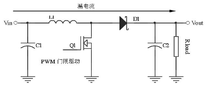 (1)電池使用壽命短:圖2 中,即使關(guān)斷升壓轉(zhuǎn)換器主開關(guān),Vin 與Vout 之間仍會(huì)形成一條電流泄露路徑,如果在輸出端接有任何負(fù)載,其中泄露電流Ileak 接近于Vin/Rload,那么漏電流的存在使的蓄電池一直處于工作狀態(tài),這樣將會(huì)縮短電池的使用壽命。