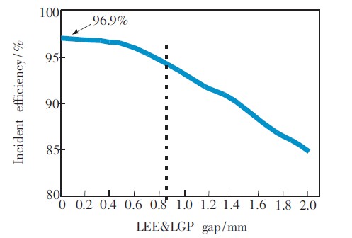 理論上LED的發光面到LGP的入光面之間的距離越小越好,這樣可以充分利用LED所發出的光;但在實際情況中,由于加工精度、不易組裝等問題,不可能達到零間距。對LED 發光面到LGP入光面的距離進行試驗,得到LED-LGP之間距離與入射效率的擬合曲線,如圖6所示。可以看出,入射效率隨LED和LGP之間的距離增大而減小,在距離小于0.8 mm時,入射效率降低比較緩慢且在95%以上。因此,考慮到實際加工精度和裝配因素,取LED發光面到LGP入光面的距離為0.8 mm。