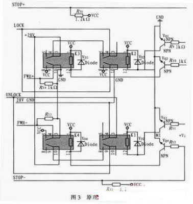 當信號D0-D5為10000時,單片機通過P10口對方位鎖定機構(gòu)發(fā)出加鎖命令,控制命令經(jīng)SN54LS245驅(qū)動后作用于R9和VQ1,VQ1導通后,繼電器K2的4、5導通,輸出+28 VLOCK信號控制電機進行加鎖。完全鎖定后,光電開關(guān)輸出(上)信號輸出高電平即圖3中STOP+,STOP+通過上拉電阻R16作用于R10和VQ2,VQ2導通后,繼電器K3的4、5和8、9導通,+28 V LOCK信號切斷,硬件上先停止加鎖控制,防止造成機構(gòu)硬件損傷。而K3的8、9導通后,F(xiàn)WH+輸出+5 V電平給單片機,單片機接收信號后,終止加鎖命令,VQ1截止,K3恢復常態(tài)。解鎖過程和加鎖過程類似,在此不作贅述。