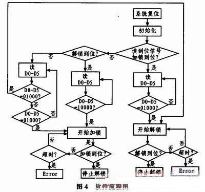 如圖2所示,單片機通過讀取外來信號D0—D5,程序內(nèi)部判斷后對鎖定機構(gòu)進行加鎖或解鎖控制,控制信號通過SN54LS245驅(qū)動后,控制圖3中繼電器的吸合來控制電機工作。沒有加解鎖控制信號或到位信號輸入時,繼電器K1、K2、K3、K4都處于3、4和9、10導通狀態(tài);當信號控制時,繼電器K1、K2、K3、K4處于4、5和8、9導通狀態(tài)。