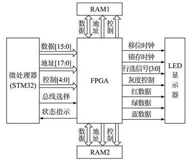 LED顯示屏是利用LED點陣模塊或像素單元組成的一種現代平面顯示屏幕,具有發光效率高、使用壽命長、視角范圍大、色彩豐富以及對室內外環境適應能力強等優點。20世紀80年代后期,它在全世界迅速發展起來,并很快成為大屏幕平板顯示的代表性主流產品;近年來,隨著藍色LED產品價格的快速下降,全彩色LED顯示屏的價格逐步降低,市場需求急劇增長,應用日益普遍。目前的LED顯示屏控制系統多采用ARM處理器來完成整個系統的功能,這種控制系統在數據處理速度上存在很大的局限,影響顯示效果的連續性?;诖?,在分析了STM32微處理器總線結構特點的基礎上,提出了STM32+FPGA的控制系統方案,該方案充分了利用STM32微處理器的靈活的儲器控制技術和可編程邏輯器件的靈活性,提高了系統數據處理的速度,而且簡化了電路結構,方便調試。