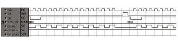 掃描驅動輸出信號的仿真波形如圖5所示,其中en是灰度控制信號,用來控制顯示時間,產生灰度效果;row_sel是行選信號,顯示時用于確定點亮哪一行;sck是移位時鐘,lck是鎖存時鐘,ds_red、ds_blue、ds_green是上屏紅、藍、綠數據的輸入端。仿真時紅、藍、綠顯示數據分別設定為01交錯、全1、全0??梢钥吹?,在移位時鐘的作用下數據移位正確,移位完成后,lck變為高電平,將數據鎖存輸出到LED屏上顯示。