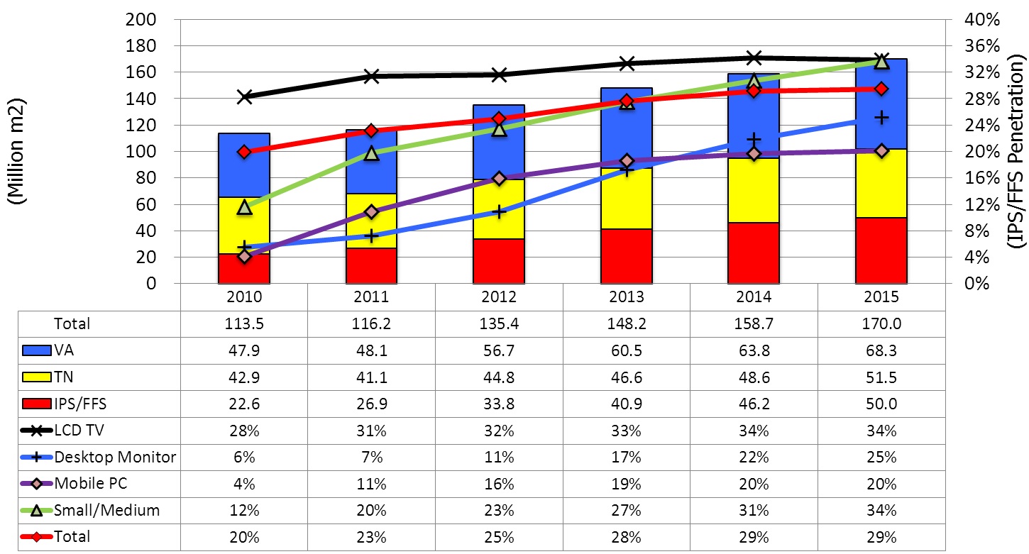 在液晶電視市場,廣視角一直是主要的賣點(diǎn)之一,其中IPS/FFS LCD面板的滲透率在2011年達(dá)到31%。在桌上型顯示器市場, IPS/FFS 面板傅統(tǒng)上被用在一些特殊應(yīng)用,例如醫(yī)療設(shè)備,2011年滲透率為7%,而NPD DisplaySearch預(yù)測這個(gè)數(shù)字在2015年將上升到25%,主因于IPS面板的領(lǐng)導(dǎo)生產(chǎn)商LG Display計(jì)劃使IPS成為桌上型顯示器面板的標(biāo)準(zhǔn)。