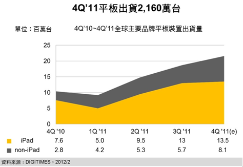 2011年第4季全球品牌平板裝置(Tablet)競爭M型化程度較原本預(yù)期明顯。DIGITIMES Research分析師汪貫中分析,在高階產(chǎn)品部分,蘋果(Apple)感恩節(jié)祭出降價促銷,掃除2011年下半景氣轉(zhuǎn)弱、iPhone 4S造成預(yù)算排擠以及Kindle Fire來襲陰霾,刺激市場買氣,也使庫存有效降低,終端產(chǎn)品組裝出貨較原先預(yù)估增加250萬臺,達(dá)1,350萬臺。