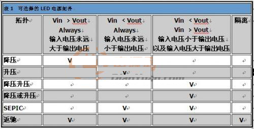 表1的信息可供作選擇LED驅(qū)動器最佳切換拓撲的參考。除了這些拓撲之外,也可以使用簡單的電流限制電阻或是線性穩(wěn)壓器,不過這些方法通常會耗用過多功率。輸入電壓范圍、驅(qū)動的LED數(shù)目、LED電流、隔離、電磁干擾(EMI)限制以及效能,都是相關(guān)的設(shè)計參數(shù)。大部分的LED驅(qū)動電路可分為以下幾種拓撲類別:降壓、升壓、降壓升壓、SEPIC以及返馳。