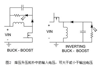 圖2顯示兩種降壓升壓電路,可在輸入電壓可能大于或小于輸出電壓的情形下使用。這些電路與前述兩種降壓拓撲有相同的折沖特點,與電流偵測電阻與門極驅(qū)動的位置有關(guān)。圖2的降壓升壓拓撲,顯示接地參考的閘極驅(qū)動。此拓撲需要位準移位電流偵測訊號,不過反向的升壓降壓拓撲則具有接地參考的電流偵測及位準移位閘極驅(qū)動。如果控制IC與負輸出有關(guān),且電流偵測電阻與LED進行交換,即可利用有效的方式配置反向升壓降壓拓撲。只要適當控制IC,即可直接測量輸出電流,也可以直接驅(qū)動MOSFET。