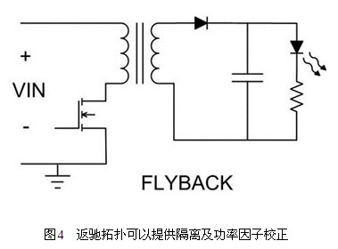 基于安全考慮,可能會規(guī)定在脫機電壓及輸出電壓之間進行隔離。此應(yīng)用方式下,最節(jié)省成本的解決方法就是使用返馳轉(zhuǎn)換器(圖4),在所有的隔離拓撲中,這種作法所需要的組件數(shù)量最少。變壓器匝數(shù)比可用來對輸出電壓進行降壓、升壓或降壓升壓,設(shè)計彈性很大,不過缺點在于電源變壓器基本上是訂制組件。此外,在FET以及輸入和輸出電容器中,也會有高組件應(yīng)力的情形出現(xiàn)。應(yīng)用固定燈光時,可以使用「慢速」的回饋控制循環(huán),調(diào)節(jié)LED電流與輸入電壓同相位的情形,進行功率因子校正(PFC)。這樣可以調(diào)節(jié)所需的平均LED電流,并能調(diào)節(jié)輸入電流與輸入電壓同相位的情形,以提供高功率因子。