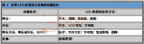 如同表2所示,LED已廣泛運用于各領(lǐng)域,因此需要許多種類的電源拓撲,支持LED的應(yīng)用。一般而言,必須考慮輸入電壓、輸出電壓及對隔離的需求,以做出適當選擇。