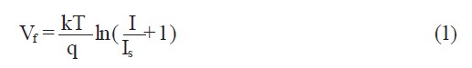 式中: I 為正向電流;n 為理想因子;k 為玻爾茲曼常數(1.38x10- 23 J /K) ; T 為溫度( 298K 或25℃) ;q 為電子電量( 1.602x10- 19 C) ;Is 為飽和電流; R 為寄生電阻;本文以西鐵成公司的發光二極管為例, 其特性參數如表1 所示。