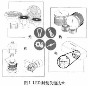 LED 的封裝技術實際上是借鑒了傳統(tǒng)的微電子封裝技術,但LED 有其獨特之處,又不能完全按照微電子封裝去做。整個LED 封裝工藝主要包括封裝原料的選取、封裝結構的設計、封裝工藝的控制以及光學設計與散熱設計,概括來講就是熱- 電- 機-光(T.E.M.O.),如圖1 所示,這是LED封裝的關鍵技術。