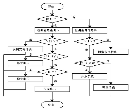 在放電過程中,首先保證在晚上12點(diǎn)前開通兩路負(fù)載,12點(diǎn)后開通一路負(fù)載,并且當(dāng)蓄電池電壓低于保護(hù)電壓(11V)時(shí),控制器自動(dòng)切換到市電供電系統(tǒng)或關(guān)閉負(fù)載開關(guān)以保護(hù)蓄電池不受損壞。因此,充電管理和放電管理是系統(tǒng)軟件設(shè)計(jì)中的主要內(nèi)容,充放電程序流程圖如圖4 所示: