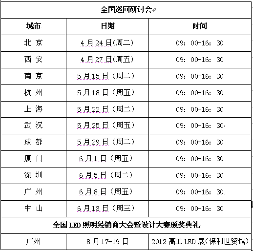 整個(gè)巡回研討會暨大賽將持續(xù)5個(gè)月時(shí)間,3月份為活動啟動宣傳階段,4-5月份為全國巡回研討及大賽報(bào)名階段,6‐8 月份為大賽作品提交及評審階段。巡回總結(jié)大會暨設(shè)計(jì)大賽頒獎(jiǎng)典禮將于2012 高工LED 展期間(8 月17 日)在廣州保利世貿(mào)館召開。