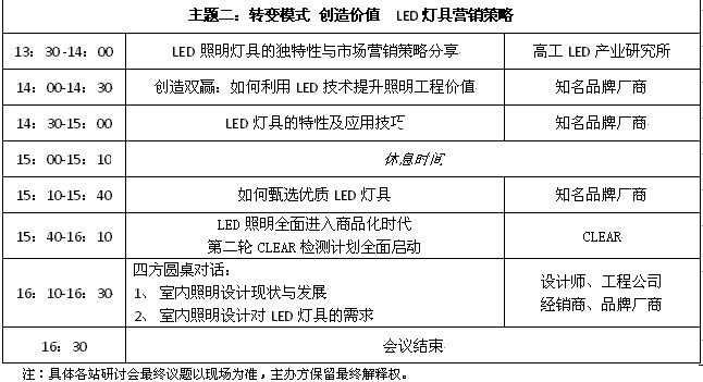 2012是高工LED的渠道年、服務(wù)年,為推廣LED照明節(jié)能產(chǎn)品,分享LED照明設(shè)計(jì)理念,增進(jìn)LED照明廠商、設(shè)計(jì)師、工程商、經(jīng)銷商之間的交流與合作,推動LED燈具在家居、酒店、別墅會所、商場鋪、專賣店、餐飲、辦公、展館、地鐵站等室內(nèi)照明中的應(yīng)用。高工LED將進(jìn)行第三次長征(2010年全國LED產(chǎn)業(yè)調(diào)研、2011年全國燈具城調(diào)研),由高工LED、高工LED商城、《高工LED產(chǎn)品與市場》雜志聯(lián)合全國各地室內(nèi)裝飾設(shè)計(jì)協(xié)會、建筑設(shè)計(jì)機(jī)構(gòu)、照明及LED行業(yè)協(xié)會共同舉辦的“2012 LED照亮中國之旅”渠道開拓活動-室內(nèi)LED照明設(shè)計(jì)全國巡回研討會暨全國室內(nèi)LED照明設(shè)計(jì)大賽,將于4‐8月在北京、西安、南京、杭州、上海、武漢、成都、廈門、深圳、廣州、中山11個(gè)重點(diǎn)城市舉辦。整個(gè)巡回研討會將有全國近1500名來自設(shè)計(jì)機(jī)構(gòu)、工程公司、經(jīng)銷商等單位專業(yè)人士參加,活動將覆蓋超過20萬設(shè)計(jì)、工程、經(jīng)銷等各渠道群體。