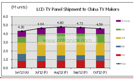 圖一、Jun’12 – Oct’12出貨至中國本土廠商電視面板數(shù)量趨勢分析