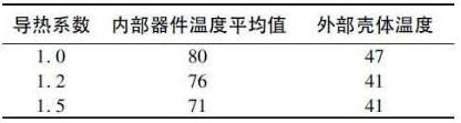 ( 3) 灌膠導(dǎo)熱系數(shù)對驅(qū)動電源散熱影響情況,由于電源的殼體結(jié)構(gòu)已經(jīng)確定,因此驅(qū)動電源的散熱主要通過膠體傳導(dǎo),將熱量傳導(dǎo)到殼體,而后通過對流散熱。表1 是導(dǎo)熱系數(shù)不同的膠體的電源器件和殼體溫度情況( 輸入電壓~ 100 V,輸出48 V/3 A,環(huán)境溫度25 ℃) .