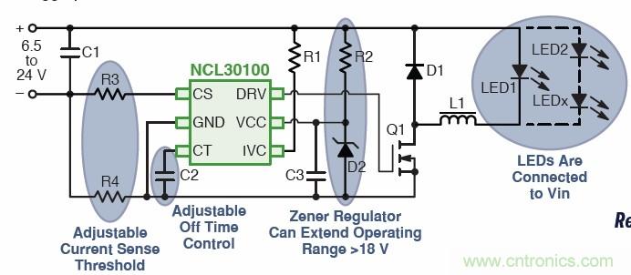 針對空間及高能效要求的低功率應(yīng)用,安森美半導(dǎo)體提供一款能效高達(dá)95%,又具有自然LED開路保護(hù)的固定關(guān)閉時(shí)間降壓LED驅(qū)動器控制器NCL30100。該器件采用準(zhǔn)固定關(guān)閉時(shí)間、峰值電流遲滯控制方法,不要求補(bǔ)償元件;其低邊N-FET開關(guān)拓?fù)溥m合連續(xù)導(dǎo)電模式工作,無須輸出電容;其工作頻率小于500 kHz,±5%典型穩(wěn)流容限,VCC工作電壓范圍為6.35至18 V。