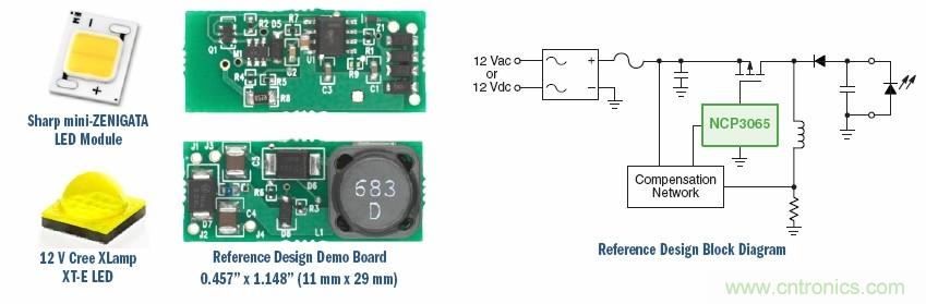 對于3至4個(gè)LED模塊的12 V AC-DC設(shè)計(jì),可以使用安森美半導(dǎo)體針對NCP3065的評估板NCP3065BBGEVB,用來驅(qū)動12 Vac/Vdc應(yīng)用中的夏普ZENIGATA™、Cree XLamp™MC-E及其他LED模塊。其特點(diǎn)是小尺寸、寬輸入和輸出工作電壓,輸出電流經(jīng)過穩(wěn)流,還具有LED開路保護(hù)、輸出短路保護(hù)能力。該解決方案適用于MR16燈泡、景觀照明、交通照明。