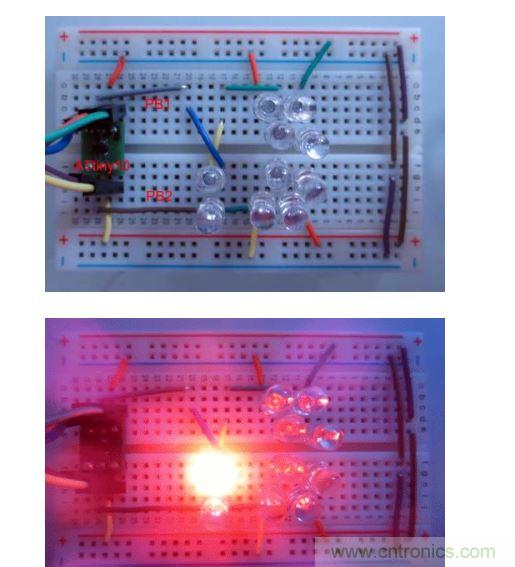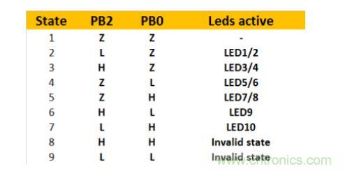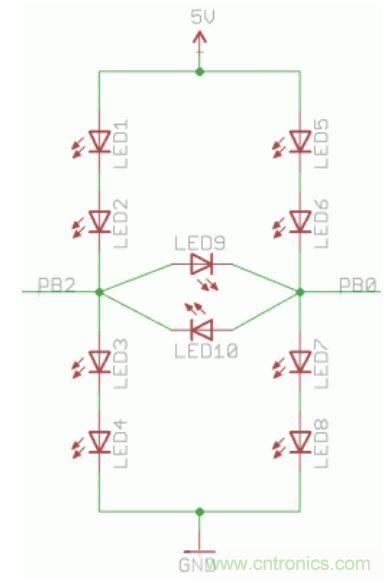 當PB0和PB2中有一個引腳處于高電平或低電平狀態,而另一個引腳為高阻抗狀態時,那就會有一對LED會發光。而當PB0為高電平而PB2為低電平或恰好相反時,LED9或LED10就將和一對LED并聯。這時大部分的電流會流過單個LED,所以這時只有LED9或LED10會發光。