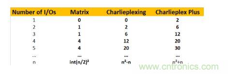 我們可以講這種新的方案成為“查理復用+(Charlieplex Plus)”。分析表明,依靠這樣的技術,一個I/O口可以比普通的查理復用技術多控制兩個LED。也就是說n個I/O口所能控制的LED數量就為2n+n²-n = n²+n。具體情況如上表所示。