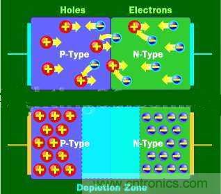 因此,電子空穴本身就顯示出是從正電區(qū)域流向負電區(qū)域。二極管是由N型半導體物質(zhì)與P型半導體物質(zhì)結(jié)合,每端都帶電子。這樣排列使電流只能從一個方向流動。當沒有電壓通過二極管時,電子就沿著過渡層之間的匯合處從N型半導體流向P型半導體,從而形成一個損耗區(qū)。在損耗區(qū)中,半導體物質(zhì)會回復到它原來的絕緣狀態(tài)--所有的這些“電子空穴”都會被填滿,所有就沒有自由電子或電子真空區(qū)和電流不能流動。