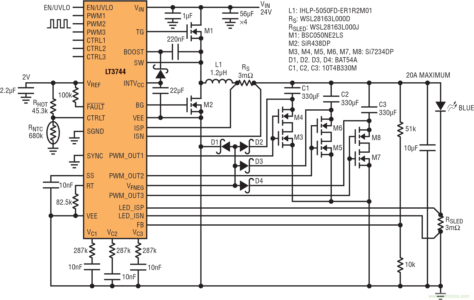 一個具備新式功率 MOSFET 的高效率大電流 LED 驅動器控制器可以提供大約 200W (解決方案尺寸大約為 4cm2),并可將所有電源通路組件的溫度限制到低于 80ºC。就高于 200W 的 LED 負載而言,LT3744 可以并聯,以限制任何組件的溫度上升。所有補償輸出都應該并聯,以允許轉換器之間的均流。