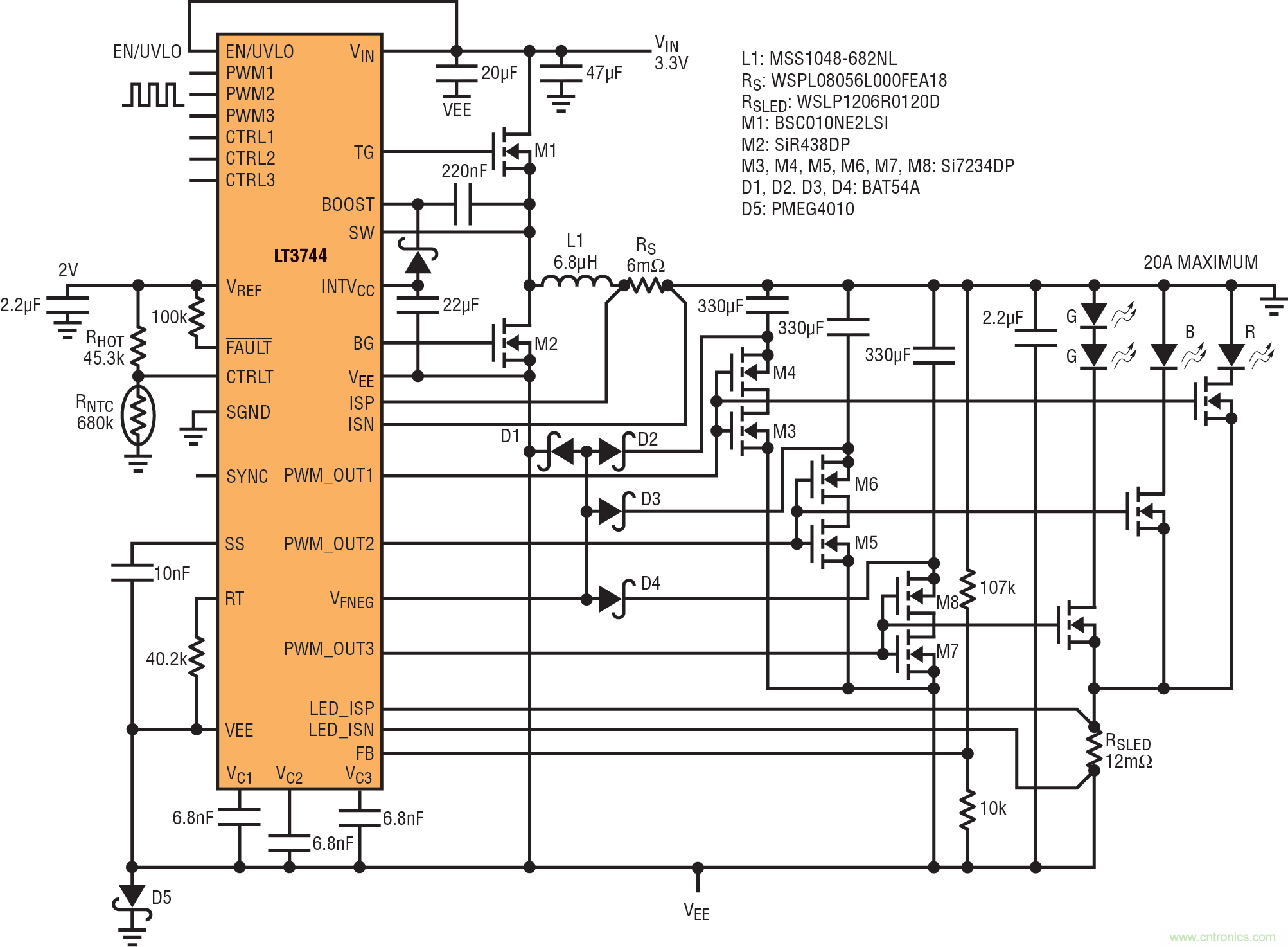 每個 LED 都可以順序接通,相互之間有一定的時間延遲,或者按照提供給 PWM 數字輸入的任何模式接通。此外,憑借 3 個獨立的模擬控制輸入,每個 LED 都能夠以不同的穩(wěn)定電流運行。當 LT3744 配置為負輸出降壓-升壓型轉換器時,單節(jié)鋰離子電池僅用單個控制器就可以驅動 3 個獨立的 LED 串。圖 7 顯示了一個專門為 RGB 微型投影儀設計的 3.3V/5A 負輸出、3 色、降壓-升壓型 LED 驅動器。
