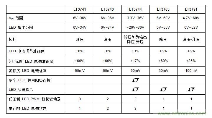 為了滿足高性能要求,LT3744 可配置為同步降壓型或負輸出降壓-升壓型控制器,以超過 20A 的連續(xù)電流驅動 LED 負載。LT3744 的電源輸入可以接受 3.3V 至 36V 電壓。作為降壓型轉換器使用時,該器件在 0V 直至電源電壓范圍內調節(jié) LED 電流。作為負輸出降壓-升壓型轉換器使用時,LT3744 可在 0V 直至 -20V 的輸出電壓范圍內準確地調節(jié) LED 電流。