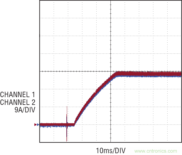 圖 8 顯示了一款 324W 轉換器,由兩個ADI DC2339A 演示電路板并聯組成。在這款設計中,每個并聯的控制器都產生 27A 電流,總共產生 54A 電流,電壓為 6V。通過將相應的補償輸出連接到一起,兩個控制器協調一致地運行,以提供平滑、良好的啟動和準確的 DC 調節(jié)。