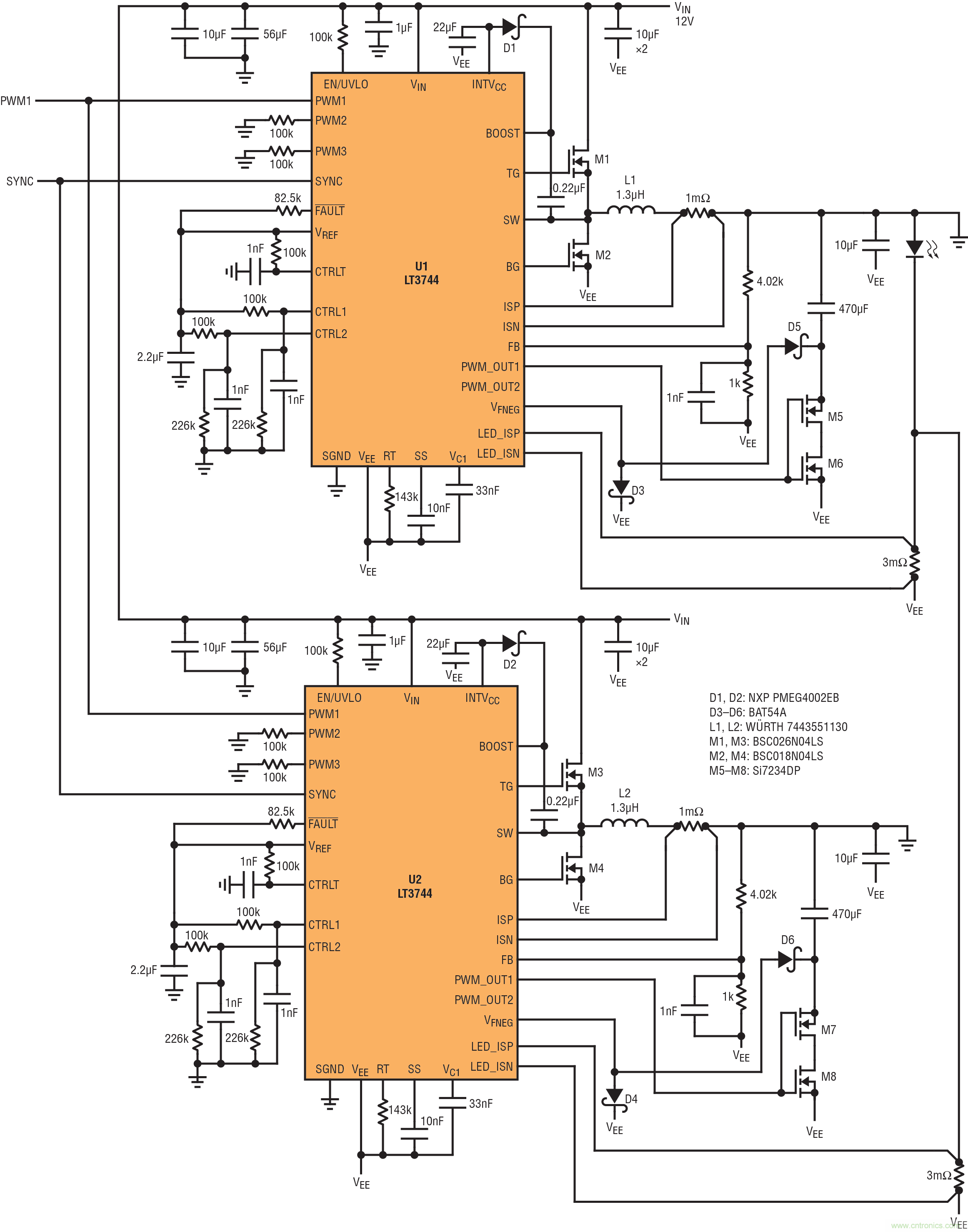 兩個 LT3744 LED 驅動器并聯以組成 324W 雙 LED 驅動器