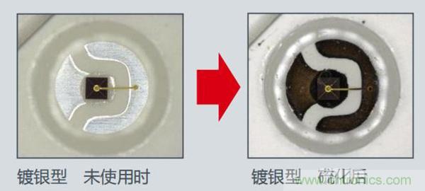 一直以來,存在元件晶片鍵合*2)所用的焊膏部位變黑導致LED發光強度降低的問題。但是,新開發LED的結構與部件,羅姆采用從元件到封裝的垂直統合型生產體制,芯片鍵合、引線、框架每個部位均可采取抗硫化措施。