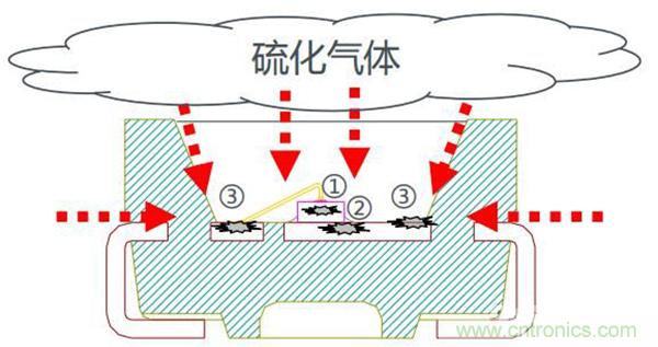 其中硫化氣體由密封樹脂/引線框架界面、引線框架/外殼界面、密封樹脂侵入,可能發生硫化的位置有4個位置: