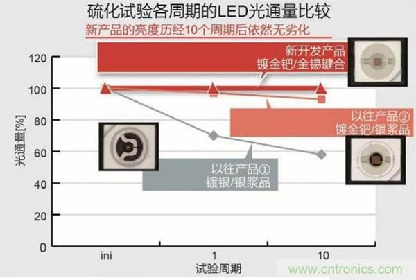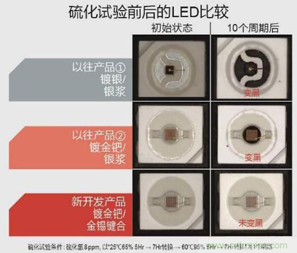 在硫化試驗中,以往使用鍍銀框架及銀漿的產品的光通量在一個周期(24小時)后為70%,10個周期后為60%,時間越長其光通量越低;而新產品可在10個循環(240小時)后依然保持幾乎100%的高光通量 。